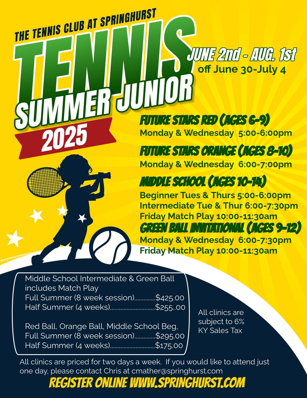 Our Summer Junior Tennis Program offers clinics for all levels & ages throughout the summer.